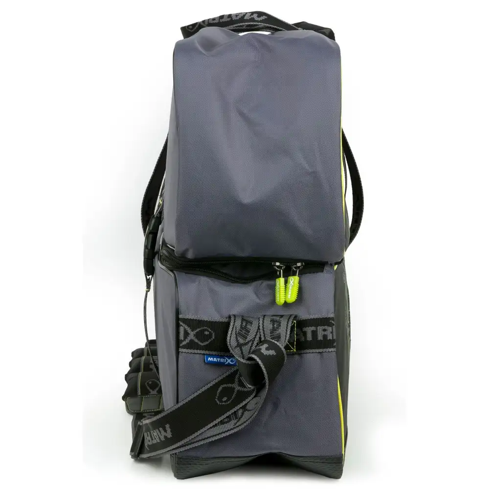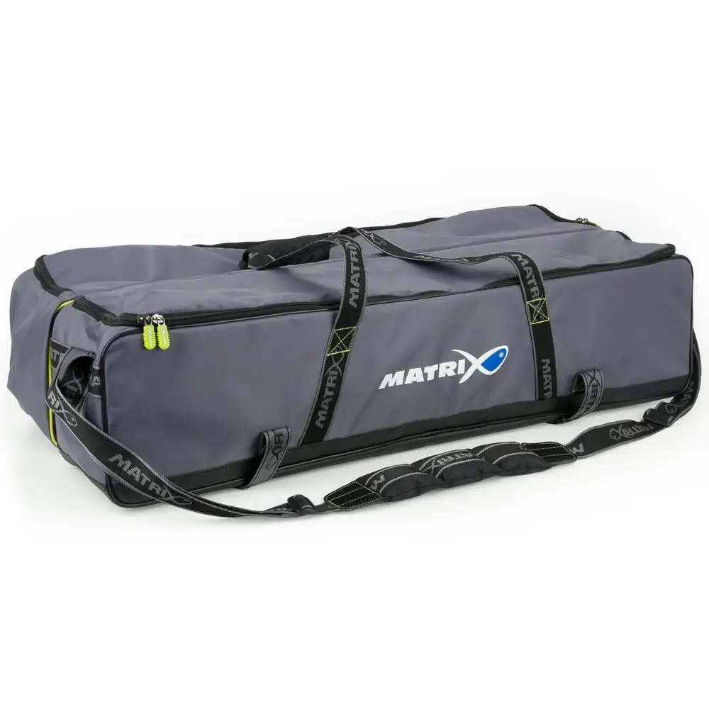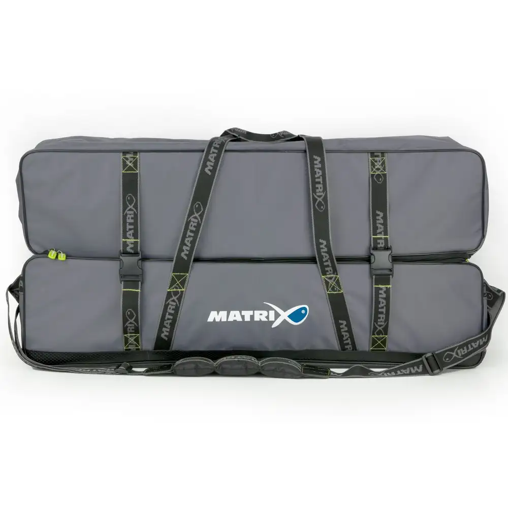 Die Matrix Ethos Pro Doppelte Jumbo Abrollertasche besteht aus 800D ultra-strapazierfähigem Polyester mit PVC-Beschichtung und verfügt über ein raffiniertes, schlankes Faltdesign, das sich in zwei gleich große Staufächer öffnet. Sie wurde so entwickelt, dass jedes Fach zwei XL-Abroller aufnehmen kann, ist aber auch ideal für die Aufbewahrung größerer Gegenstände wie Feederarme, Zubehörstangen oder lange Sitzkastenbeine.