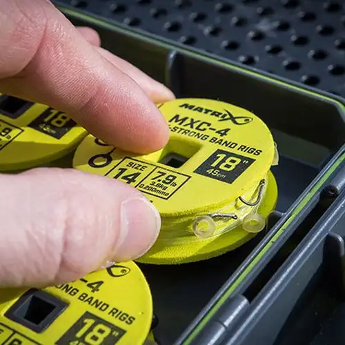 Die Vorfächer sind exakt auf 45cm (18″) gebunden, damit sie sich sicher in den Matrix EVA-Aufbewahrungsboxen lagern lassen. Die langlebigen Matrix-Köderbänder, die mit der „Band in a Loop“-Methode von Jamie Hughes mit der Power Micron Monofilschnur, gebunden wurden, bieten eine bessere Präsentation und diese Methode verlängert außerdem die Lebensdauer der Köderbänder.