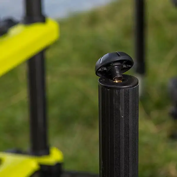 Die verrutschfreie Fußplatte kann bei Nichtbenutzung problemlos unter den Rahmen geschoben werden, damit eine karrenfreundliches Profil entsteht, das sich gut transportieren und verstauen lässt.